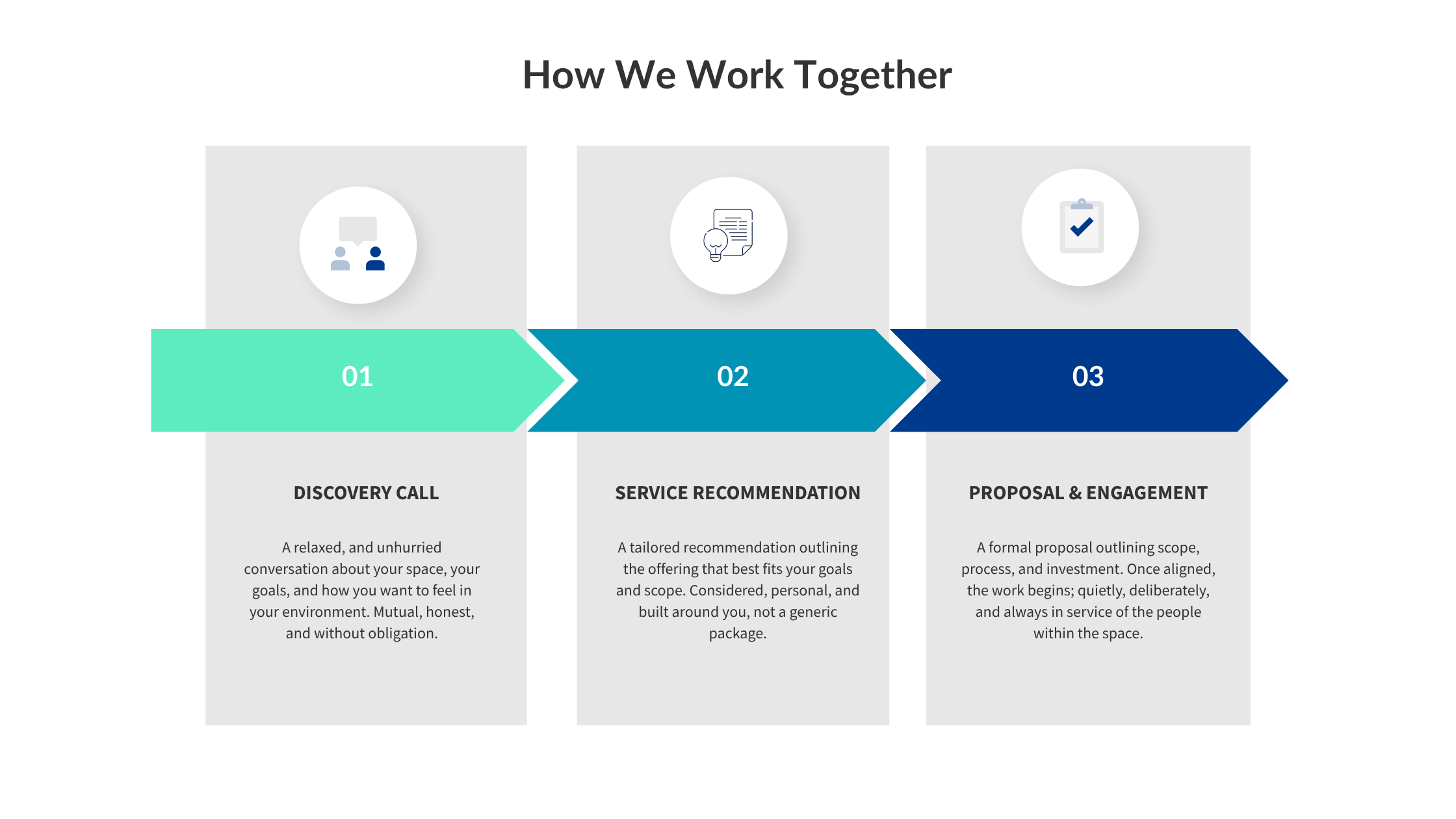 Every engagement starts with listening; to the space, to the person, and to what the environment needs to do. What follows is intentional, calibrated, and quietly transformative.